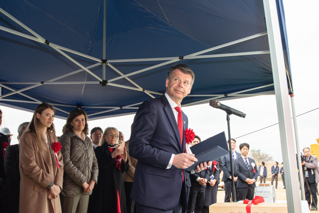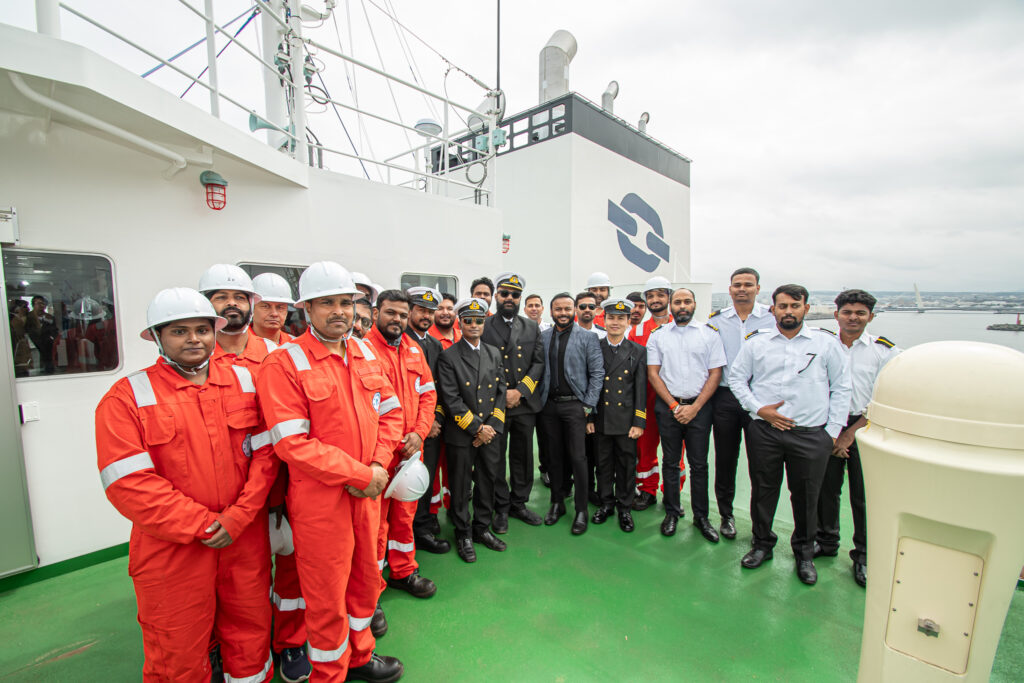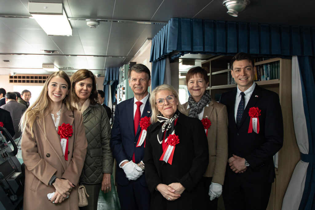 The charterers traveled long way from Norway and Brazil to attend the ceremony. The shipowner joined us from Ehime Prefecture, and we were honored to welcome guests from Tokyo and Miyagi. We were also honored by the presence of the Norwegian Ambassador and representatives from various financers. Furthermore, the local medias also attended the event and interviewed the vessel’s energy-saving capabilities.