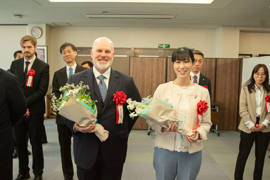 We, shipyard would like to express our sincere gratitude to the Singaporean owner and other relatives from U.S.A., Spain, Ehime, Kochi, and Tokyo for coming to Hachinohe. Appreciate for your visiting us. The ceremony was held at headquarters reception room due to severe rough sea condition fortunately, the all events were safely completed with all guests.